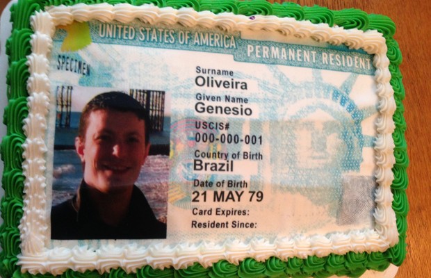 No dia 4 de janeiro desse ano, o brasileiro Genésio Oliveira e o americano Tim Coco celebraram 13 anos de relacionamento. Para comemorar, encomendaram um bolo especial, com a imagem de Genésio em açúcar de confeiteiro, a estátua da liberdade ao fundo e as palavras "permanent resident" (residente permanente) em destaque. Era a reprodução do "green card", a permissão para morar nos Estados Unidos, recebida por Genésio dois dias antes.